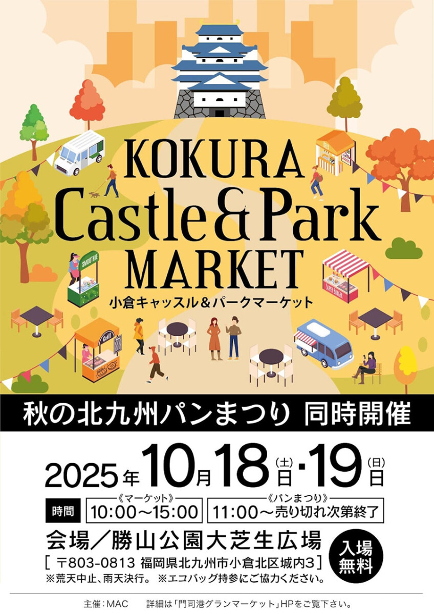 勝山公園にキッチンカーや雑貨、グルメなどが集まる屋外マーケットを開催します。秋の空の下、小倉城エリアでのんびりとした時間をお楽しみください。
